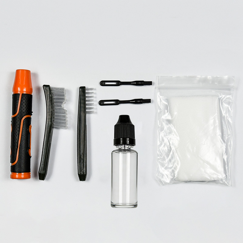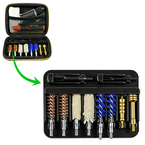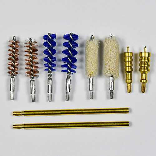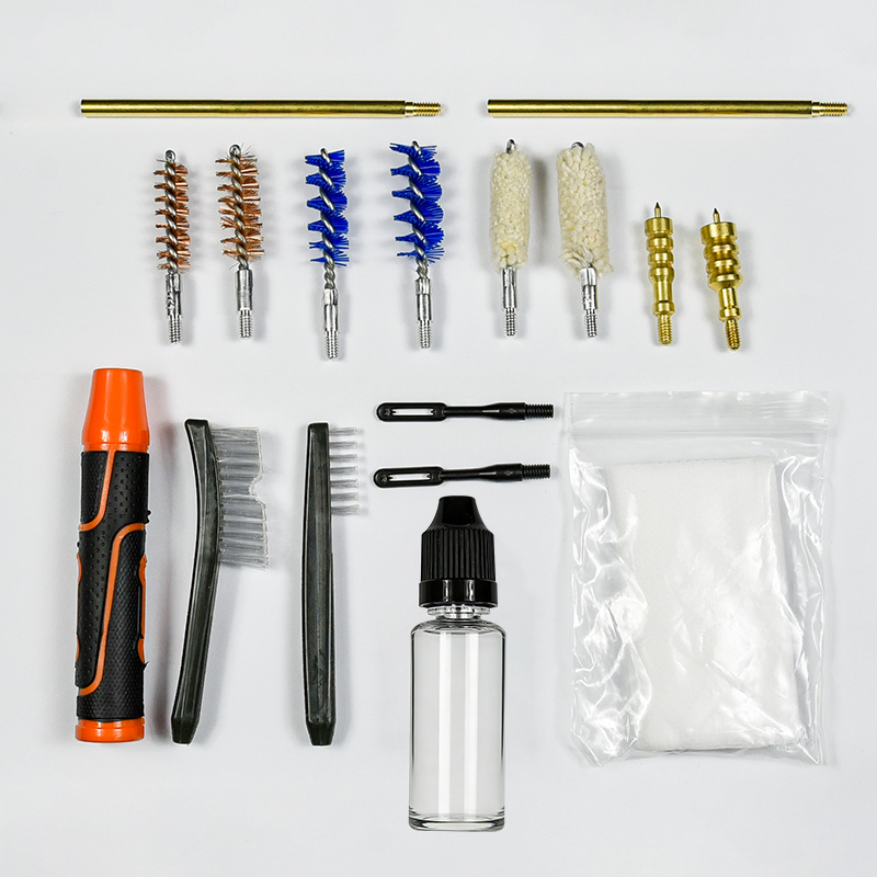 ຊຸດທຳຄວາມສະອາດປືນມືມີ 2 ຂະໜາດ (9mm & .45 cal.). ຜ້າ OX ເຄືອບ ກໍລະນີ PVC ມີ zip. ແປງທອງເຫລືອງ, mops ຝ້າຍ, ແປງ nylon, jags ທອງເຫຼືອງ, 2 ເຊືອກ. ດິນຊາຍແລະສີດໍາສໍາລັບການເລືອກ.
