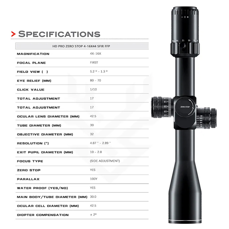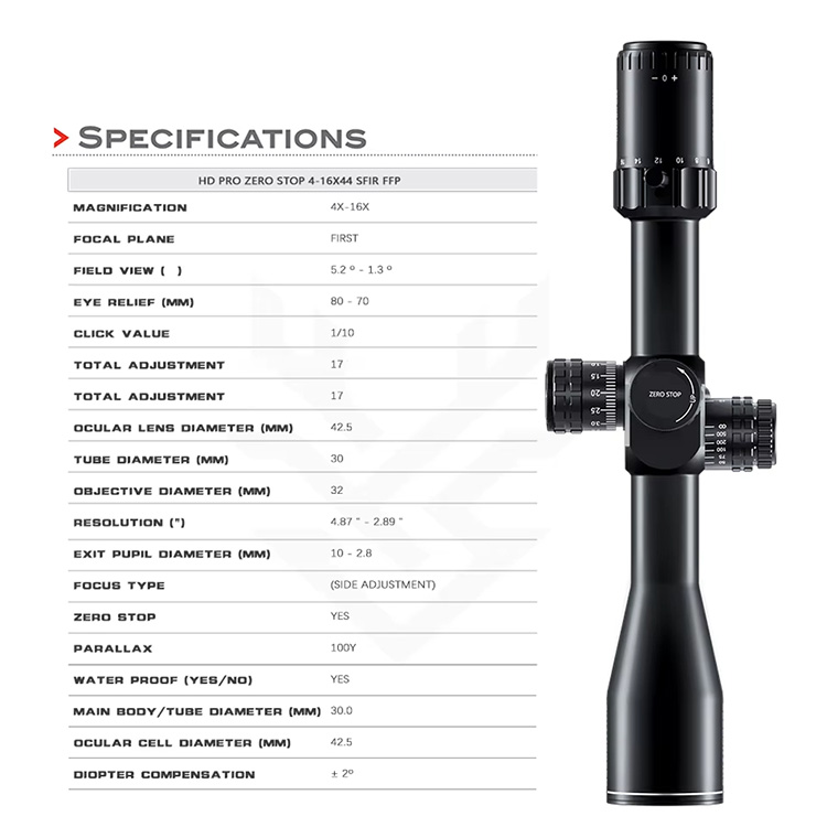 Optics HD PRO SHICE STOP 4-16X44 SFIR FFP ການລ່າສັດຕ້ານຄວາມຕ້ານທານສູງ