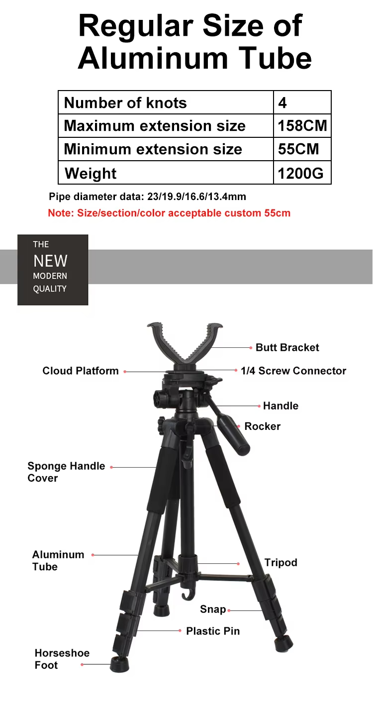 ອາລູມິນຽມ tripod, mount ປືນທົນທານ, ຄວາມສູງທີ່ສາມາດປັບໄດ້