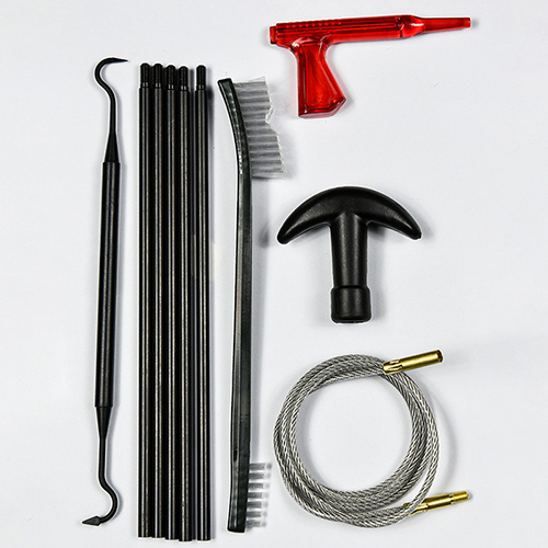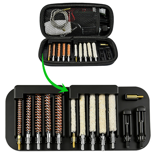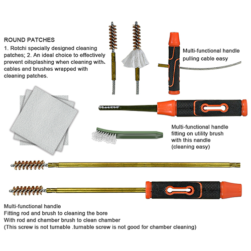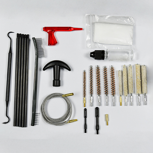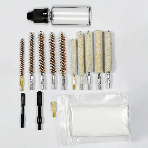 ຊຸດທຳຄວາມສະອາດປືນມີ 5 ຂະໜາດ (.177, .22, .243, .27, .30 cal.), ແປງທອງເຫລືອງ ແລະຜ້າຝ້າຍ, 5 ເສັ້ນ, 2 calbes. ດິນຊາຍແລະສີດໍາສໍາລັບການເລືອກ.